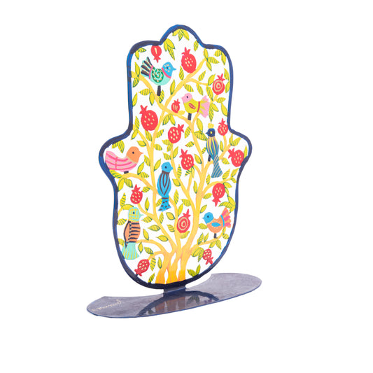 Hand-Painted Standing Hamsa - Tree of Life with Birds and Pomegranates