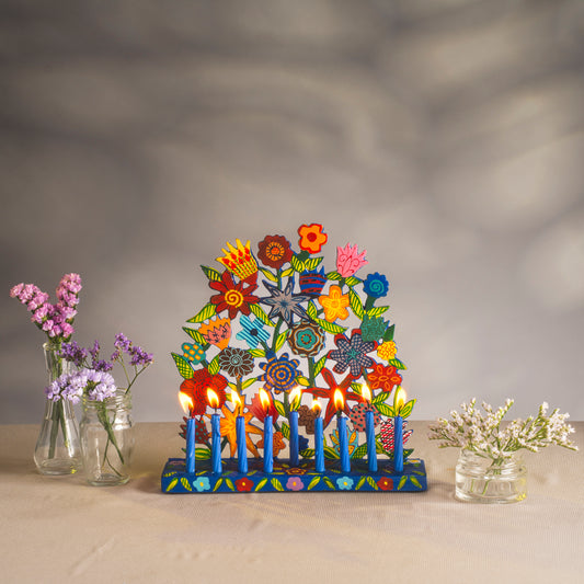Laser-Cut Hanukkah Menorah Hand-Painted Floral Pattern