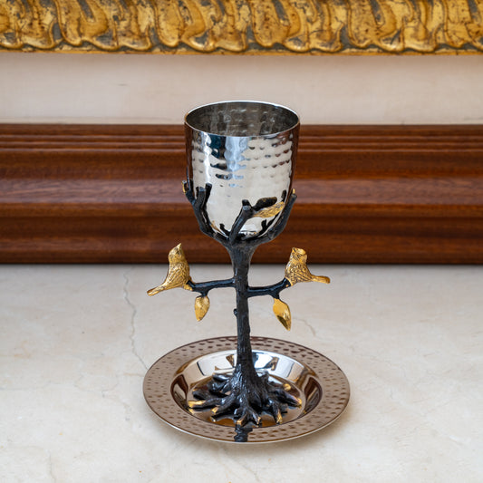 Tree of Life Kiddush Cup – Gold Accent Leaves and Birds with Saucer