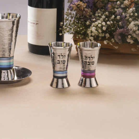 Small Hammered Aluminum Kiddush Cups with Engraved 'Yeled Tov' and 'Yalda Tova'