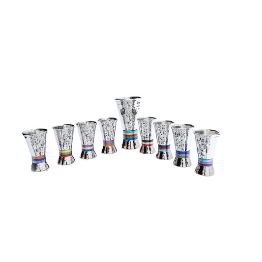Hammered Kiddush Fountain Set – 8 Cups with Colorful Aluminum Rings