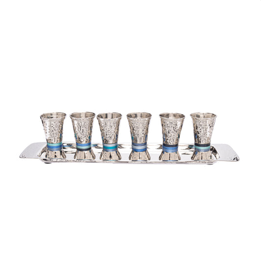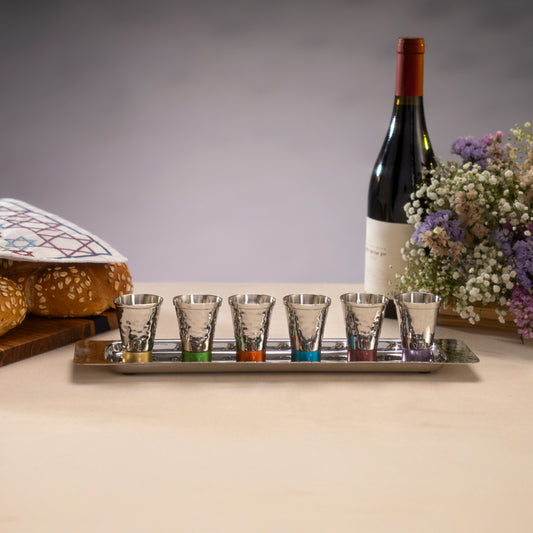 Anodized Aluminum Kiddush Cup Set – 6 Cups with Tray