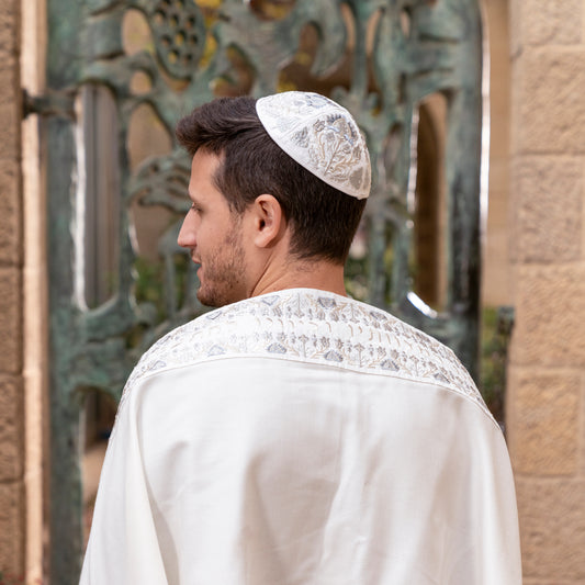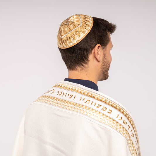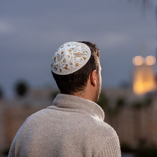 Premium Embroidered Kippah - Birds and Flowers - Gold