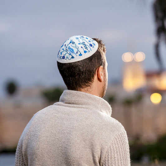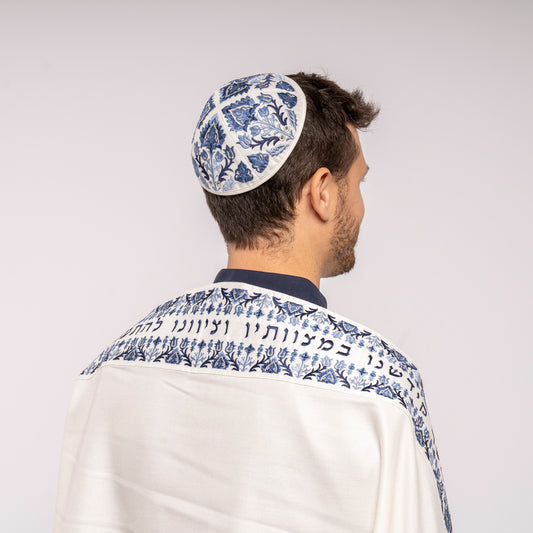 Premium Embroidered Kippah - Birds and Flowers - Blue