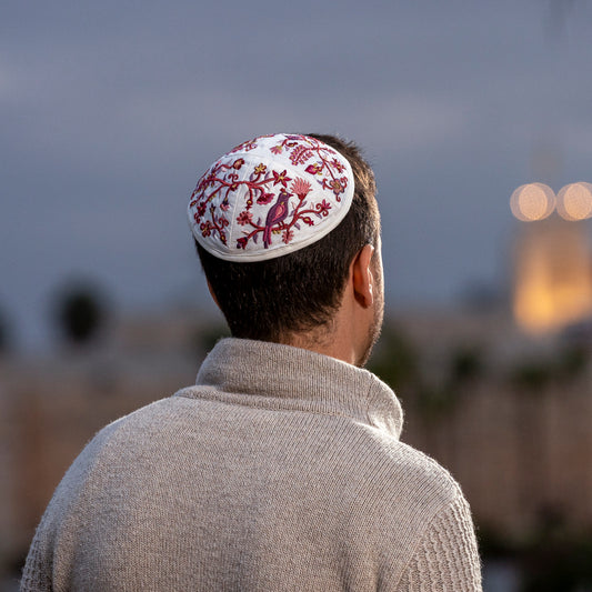 Premium Embroidered Kippah - Birds and Flowers - Maroon