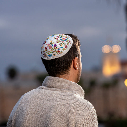 Premium Embroidered Kippah - Multicolored Birds and Flowers