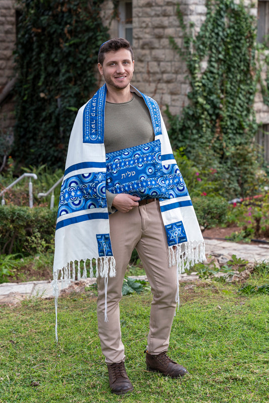 Large Embroidered Silk Tallit Set - Geometric Blue Magen David