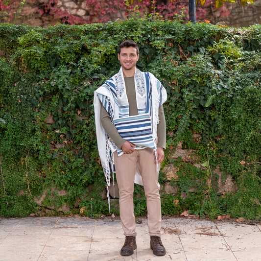 Luxurious Large Jerusalem Embroidered Tallit Set - Blue - 41x72