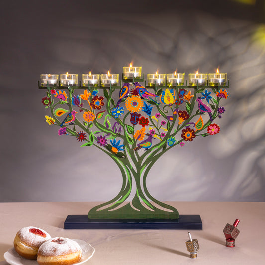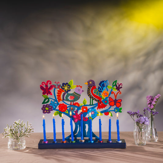 Large Hanukkah Menorah - Tree of Life with Hand-Painted Birds & Flowers