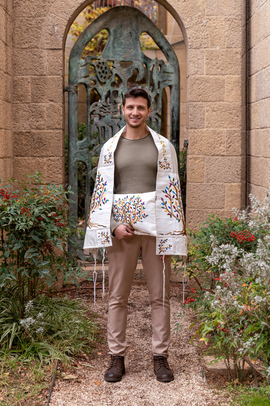 Embroidered Silk Tallit Set - Multicolor Tree of Life Design